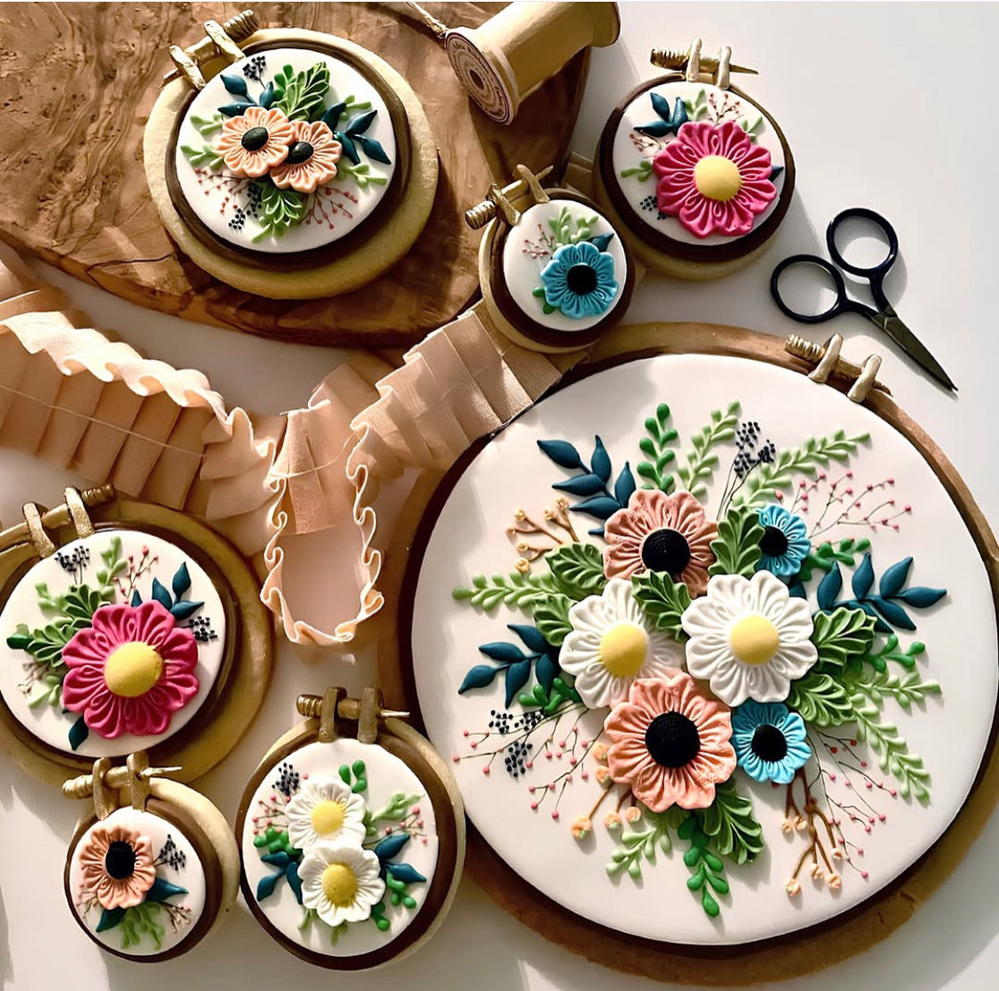 Learn to work with fondant and royal icing to create stunning embroidery hoop cookies. We'll talk through the ins and outs of baking a LARGE cookie to keep its shape.