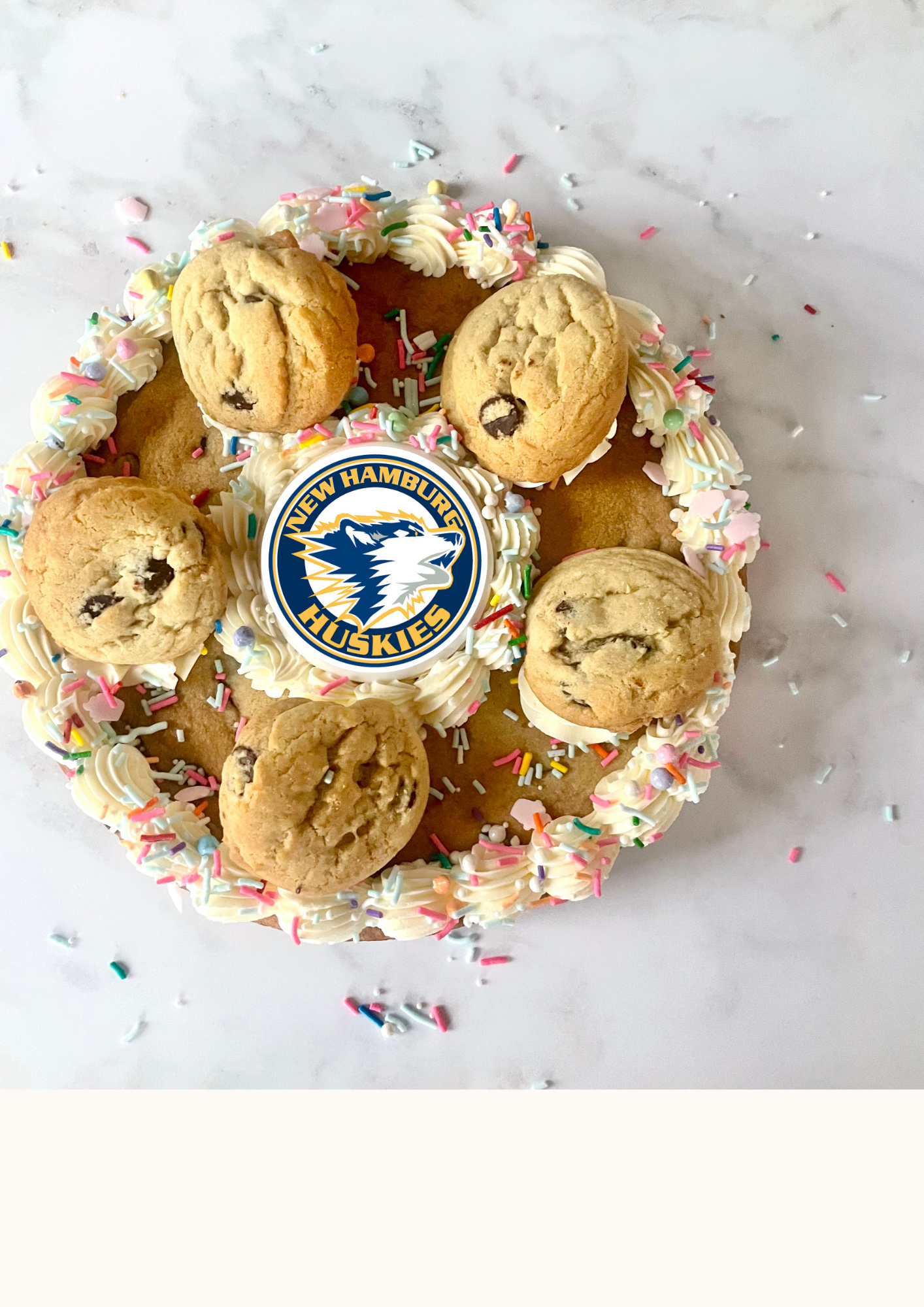 1 large 8" round gourmet chocolate chip cookie topped with mini gourmet chocolate chip cookies, buttercream, sprinkles, and Huskies logo cookie